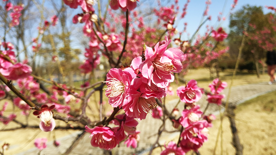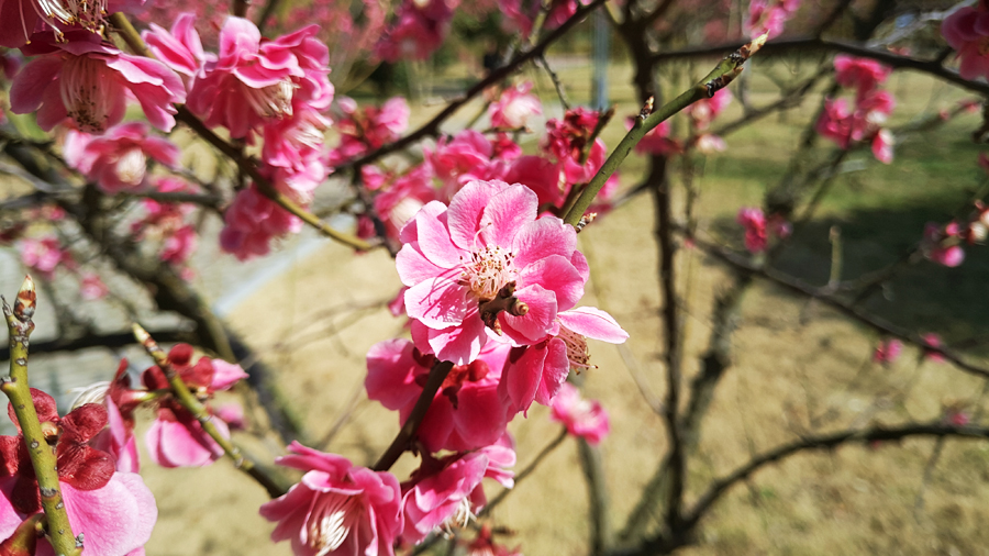 桃花朵朵开 初春,公园里一朵朵粉红色桃花竞相开放,不到一周,满树都红了!——红花 记得去年早些时候,闺女把一枝梅花拿回家中,放在花瓶里,摆在玩具房的窗台边的书桌上。粉红色的花朵在阳光照射下,显得格外鲜艳。(红梅花开) 花朵比较多,看着惊艳,闻着也觉得清香。